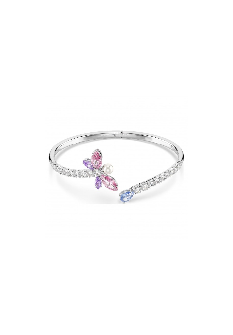 In a brilliant display of Swarovski savoir-faire, this Idyllia bangle combines a fresh mix of cuts and colors. The rhodium-plated design features two delicate flowers, precision-crafted from yellow and clear Swarovski Zirconia