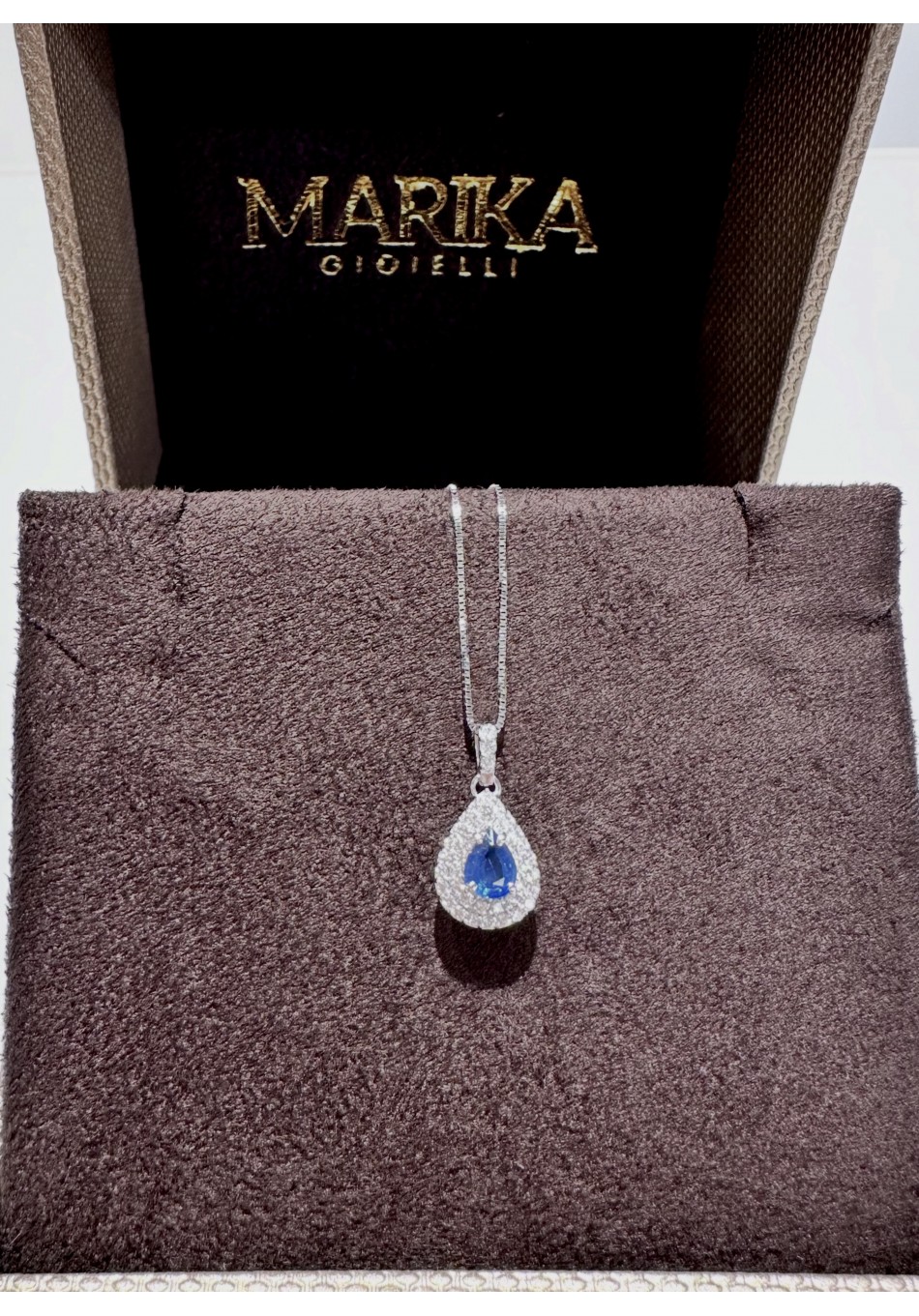 18 kt white gold necklace with 0.55 ct brilliant cut diamonds and 0.61 ct sapphire