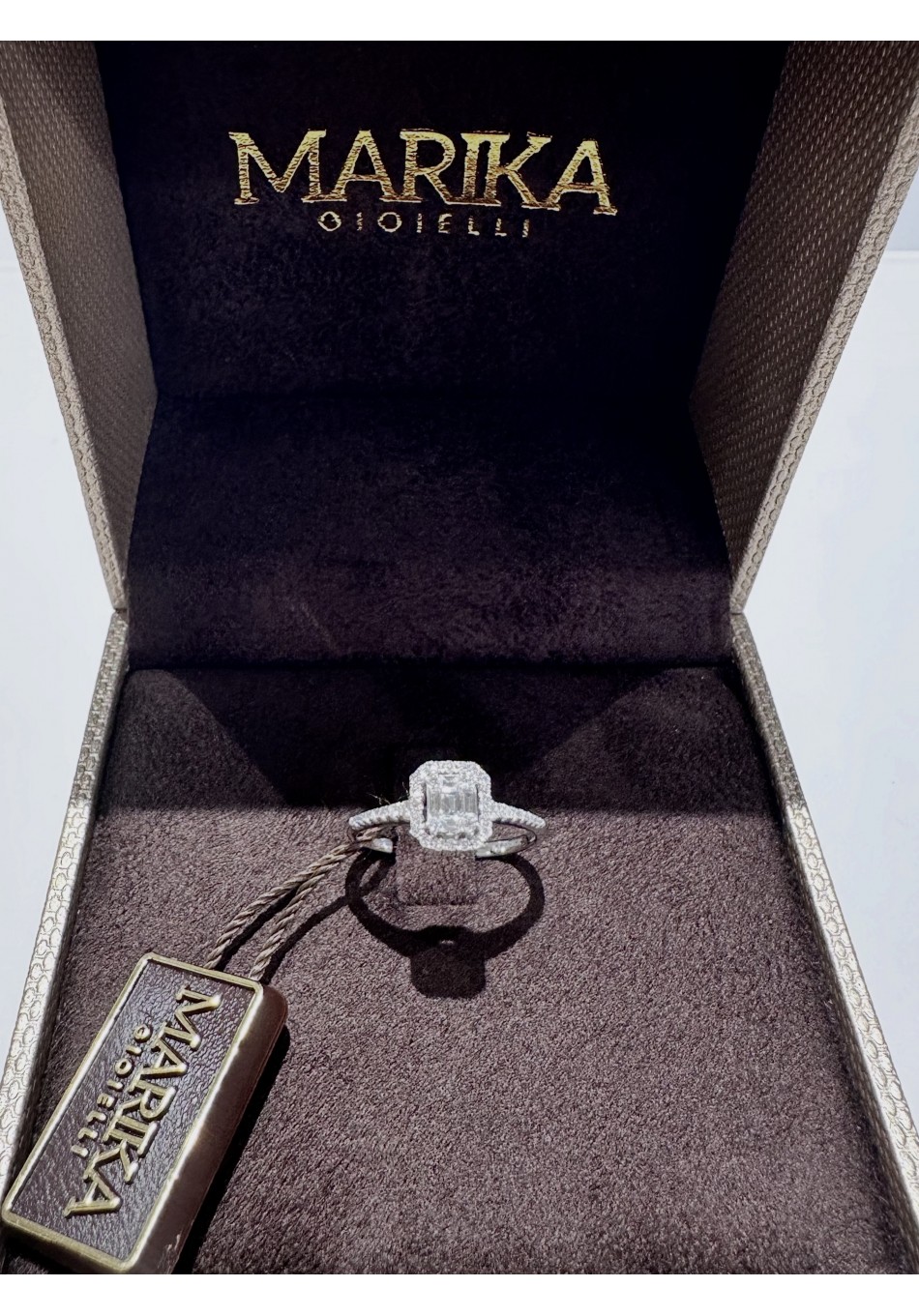 18 KT white gold "veretta" ring with brilliant cut diamond 0.10 ct G color and emeralds ct 0.72