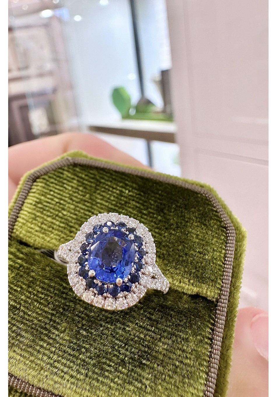 18 kt white gold ring with 0.56 ct brilliant cut diamonds and 0.97 ct sapphire