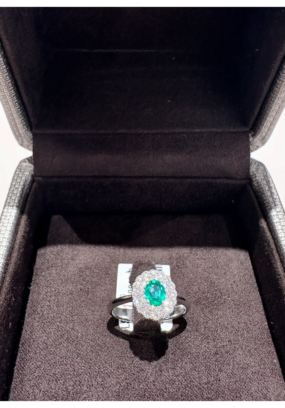 18 Kt white gold ring with 0.94 ct brilliant cut diamonds and 1.16 ct emerald