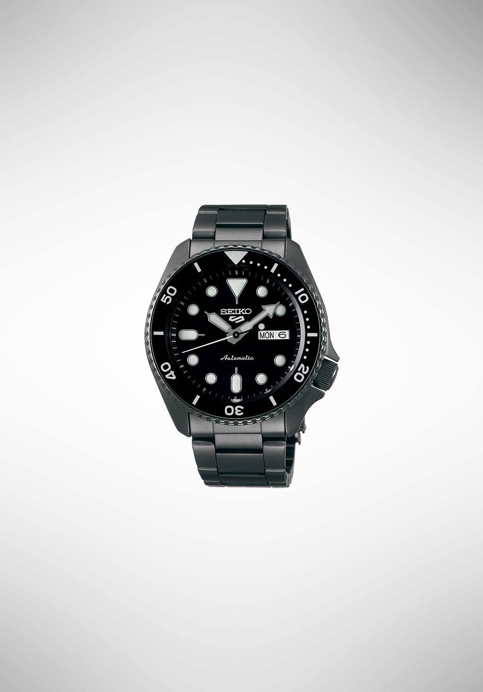 The Seiko 5 sport series welcomes the new GMT SKX watches. The SSK003K1 is conveniently equipped with a two-tone rotating bezel graduated over 24 hours to allow the reading of an additional time zone distinguishing between day and night.