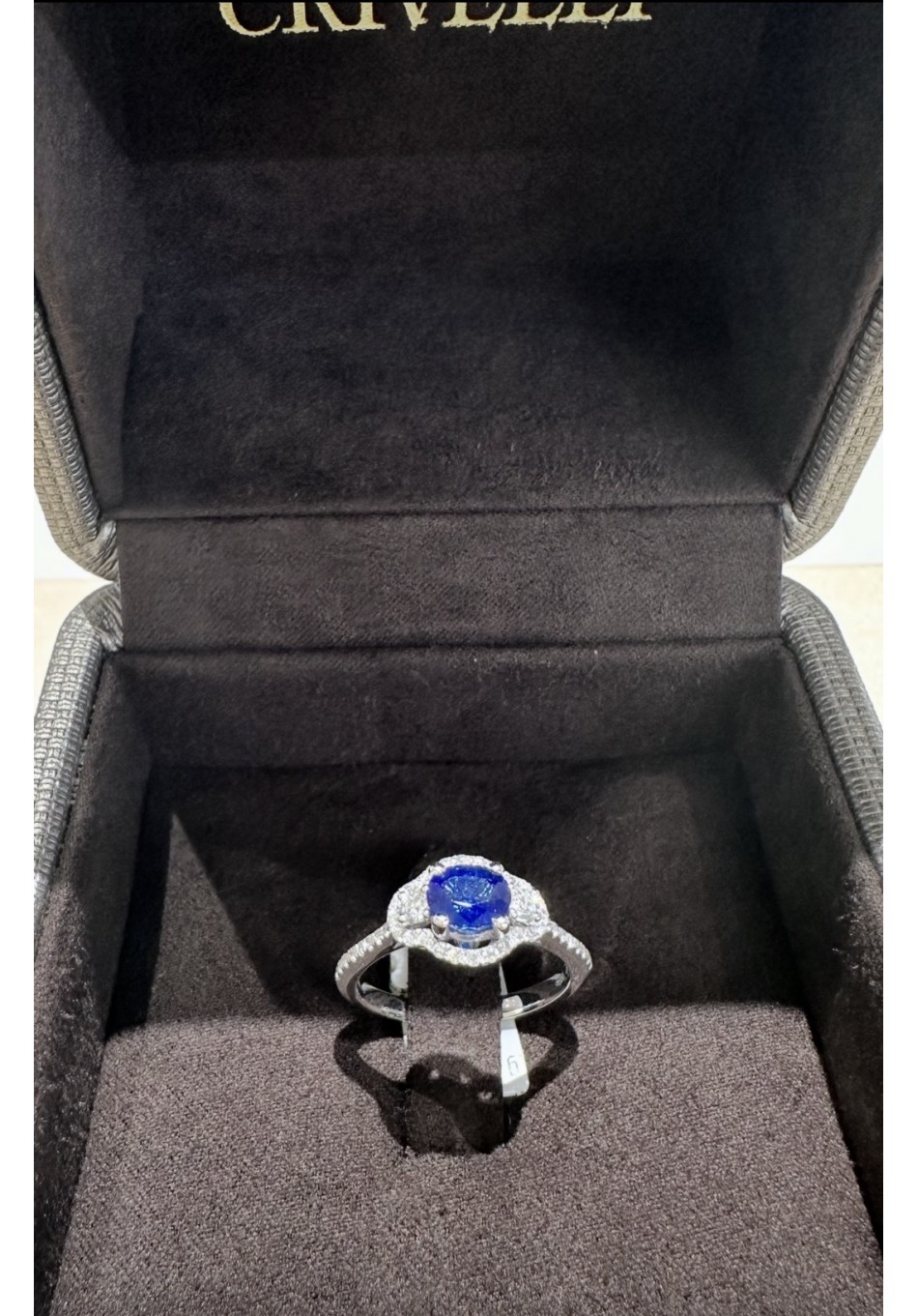 Anello in oro bianco 18 carati con diamanti a taglio brillante ct 0,37 G color e zaffiro ct 0,82