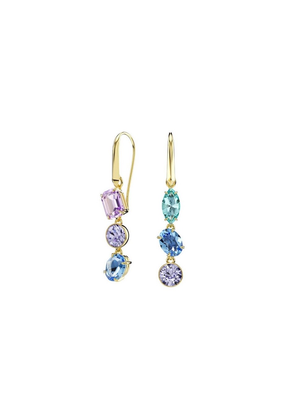 Sprigionando gioia e individualità, gli orecchini asimmetrici aggiungeranno gocce di puro colore a qualsiasi tuo outfit. Ogni filo presenta tre cristalli di forma diversa in una montatura placcata in tonalità oro, che rivelano sfumature di viola e blu che brillano alla luce.